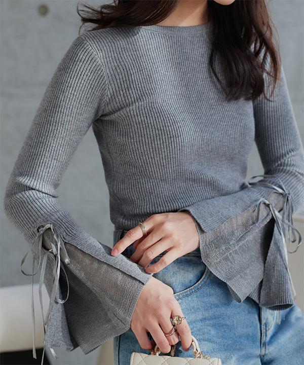 リボンデザインフレアスリーブリブニット [N1301]