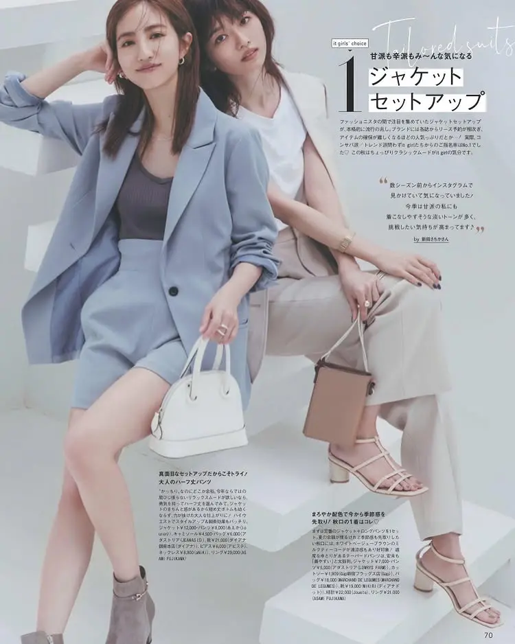 くすんだブルーのジャケットとショートパンツのセットアップコーデです。