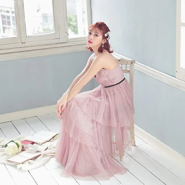 ロングドレス: 【TiKa】 ドット柄チュールシフォン刺繍レースロングドレス