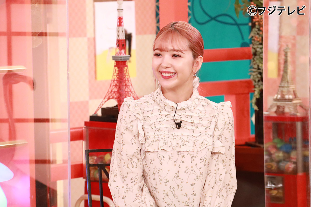 11月19日放送の「爆買い☆スター恩返しSP」に出演しました。 首元や肩にフリルがついていて緑の葉っぱがプリントされたオフホワイトのシャツを着ています。