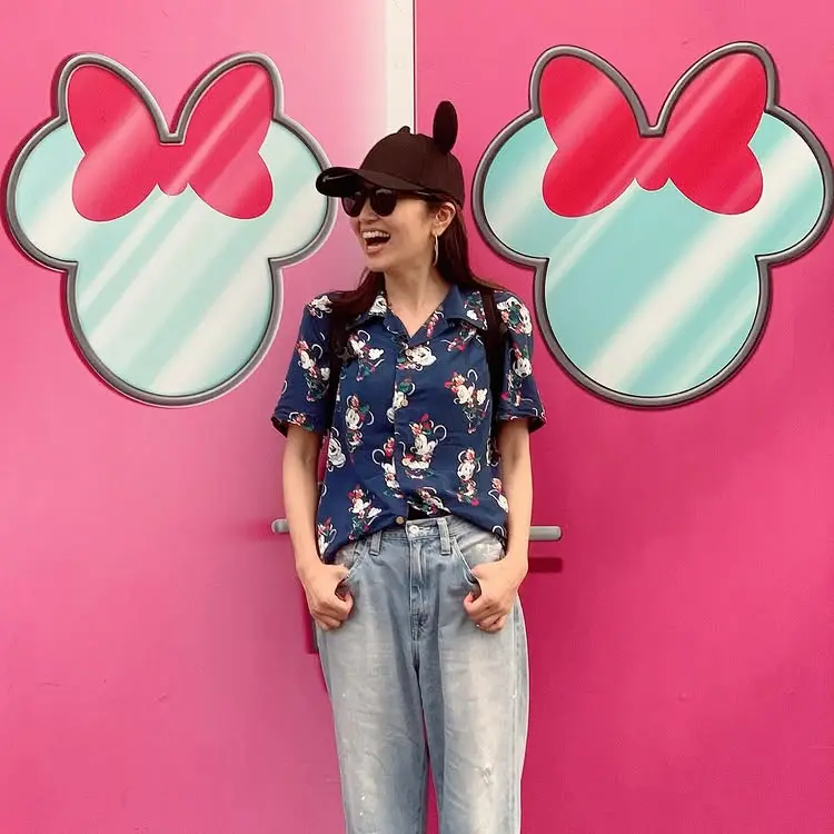 ファッションブランド「東京ディズニーリゾート」の「2018 ミニー アロハシャツ」を着用している芸能人のコーデをまとめています